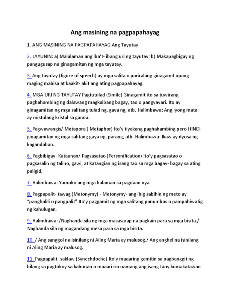 Hingin mo ang kaniyang kamay5. Tayutay Ito ay isang sinadyang paglayo sa karaniwang paggamit ng mga salita upang gawing mabisa matalinghaga makulay at kaakit-akit ang pagpapahayag. Ang mga sumusunod ay mga uri halimbawa ng tayutay at ang kahulugan ng mga ito.