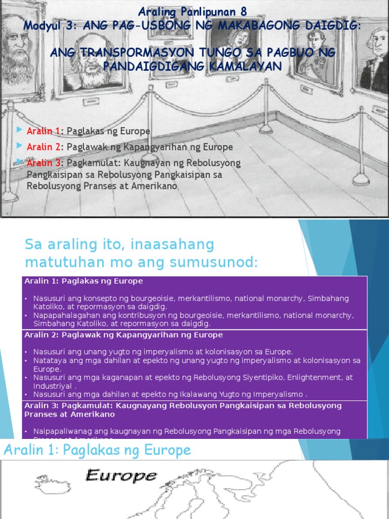Nakikilala ang mga naging pangunahing tagapagtaguyod ng pagbabagong pampulitika at panlipunan sa Amerika Pransiya at Haiti 4. Naipaghahambing ang dahilan at epektong naidulot sa pulitika at lipunan ng Rebolusyon sa Amerika Pransiya at Haiti 3 3. Ang pagtuklas ng mga Siyentipoko sa agham ay naging dahilan upang gamitin ang mga kaalamang ito sa pagpapaliwanag ng mga bagay at ito ay tinawag na enlightenment.