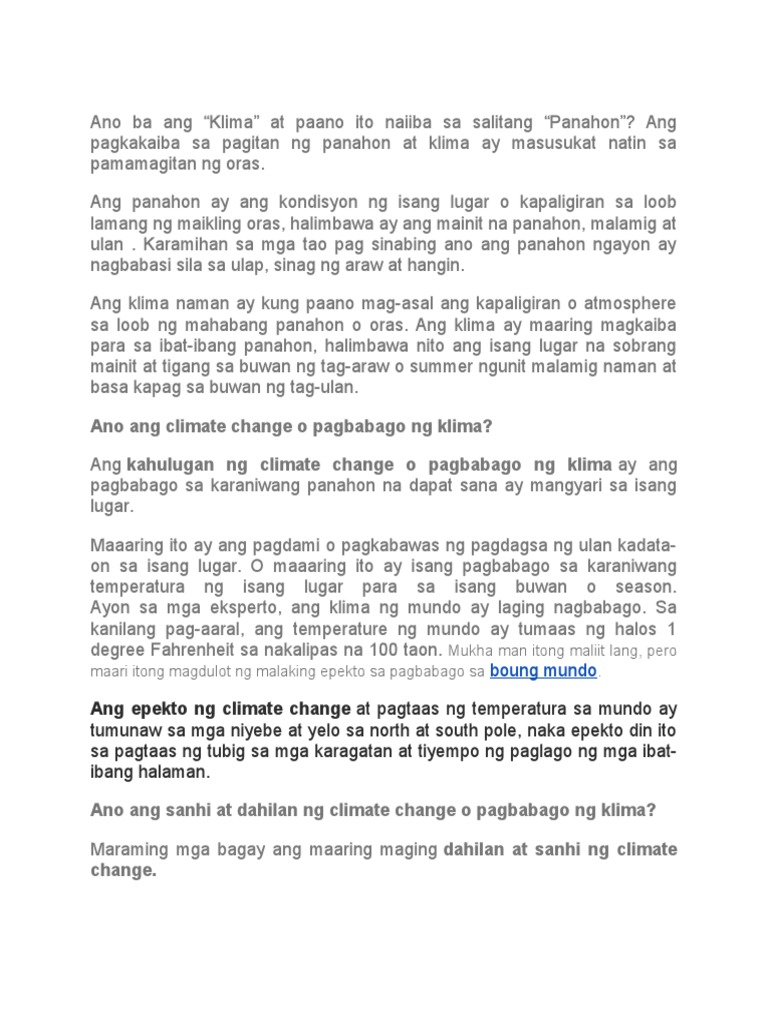 Tumaas ng 06 02 Celsius 11 04 Fahrenheit ang temperatura sa loob ng ika-20 siglo ang katamtamang pandaidigang temperatura. Ang mga epekto na ang mga kumbinasyon ng malubhang mga kaganapan sa klima at sibil kontrahan ay sa Pilipino ang mga kababaihan ay karagdagang exacerbated sa pamamagitan ng mga namimili ng mga patakaran mga paniniwala at kasanayan at pinaghihigpitan ang access sa mga mapagkukunan. Kami ang mga opisyal at kawani ng Kagawaran ng Edukasyon ay kaisa ng sambayanang Pilipino sa laban sa pagpuksa ng COVID-19.